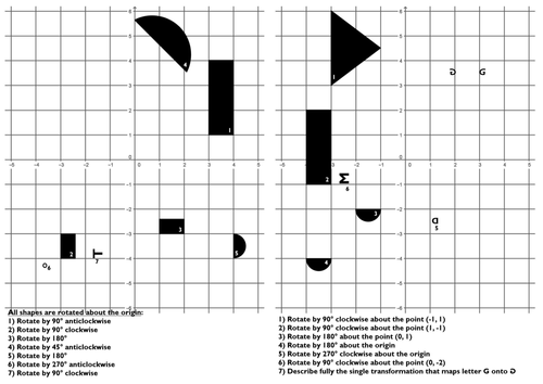 Rotations about the Origin - Online Math Learning Math Worksheets; High School Math based on the topics required for the Regents Exam conducted by NYSED. In this lesson, we will look at rotation in the coordinate plane where the center of rotation is at the origin. A positive angle of rotation turns the figure counterclockwise, and a negative angle of rotation turns the figure in a clockwise direction. The following figures show … Geometry Worksheets - Math-Drills Transformations worksheets for translations, reflections, rotations and dilations practice. Here are two quick and easy ways to check students' answers on the transformational geometry worksheets below. First, you can line up the student's page and the answer page and hold it up to the light. Moving/sliding the pages slightly will show you if ... Free Printable Math Worksheets for Geometry - Kuta Software Free Geometry worksheets created with Infinite Geometry. Printable in convenient PDF format. Kuta Software. Open main menu . Products Free Worksheets Infinite Pre-Algebra Infinite Algebra 1. Infinite Geometry. Infinite Algebra 2. Infinite Precalculus. Infinite Calculus. Buy Online Purchase Orders Renewals. Download Free Trial Retail Version . Support About Us Account Manager …